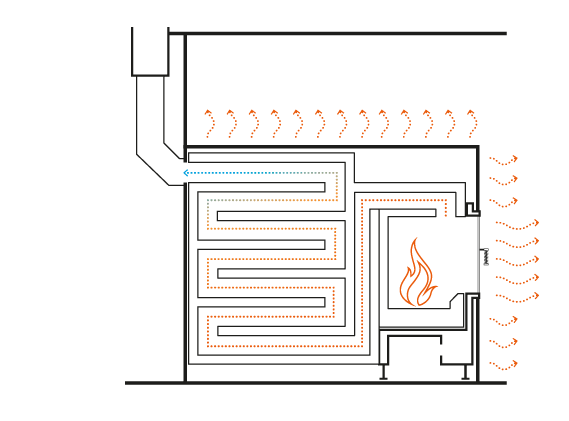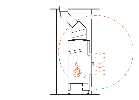 Kominek powietrzny jest idealnym rozwiąza- niem, jeśli powietrze w pomieszczeniu ma się szybko i intensywnie nagrzać. Wypływające z paleniska spaliny ogrze- wają powietrze w pomieszczeniu dzięki dużej powierzchni grzewczej na stalowym wymienniku ciepła. Nagrzane powietrze nawiewane jest do pomieszczenia przez kratki wentylacyjne w pomieszczeniu lub jest doprowadzane przez przewody do innych pomieszczeń. W dolnej części kominka jest zasysane zimne powietrze z pomieszczenia, które ponownie jest ogrzewane.