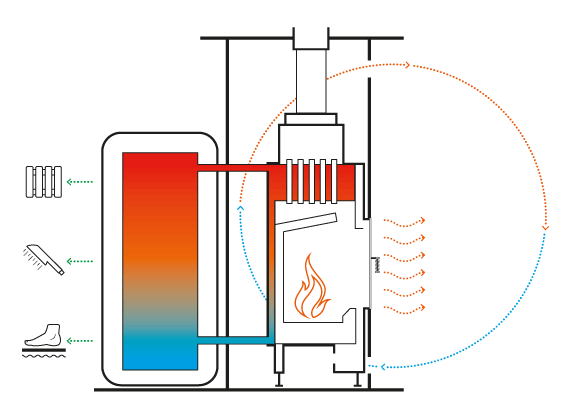 Kominek z płaszczem wodnym służy jako źródło ciepła do ogrzania całego domu lub do podgrzewania wody użytkowej. Ciepłe gazy spalania z paleniska przepływają przez wymiennik ciepłej wody umieszczony nad paleniskiem. Woda podgrzana do 70–80 °C w wymienniku ciepłej wody prowadzona jest do zbiornika akumulacyjnego. Ciepło zmagazynowane w zbiorniku akumulacyjnym jest zużywane wedle potrzeb do ogrzewania kaloryferów, ogrzewania podłogowego czy do ogrzewania wody użytkowej.